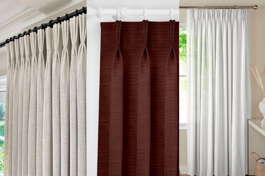 Pinch pleat curtains feature two or three pleats (double or triple) that are sewn into the fabric at regular intervals, creating a structured, uniform appearance. These pleats result in graceful folds that fall neatly from top to bottom.